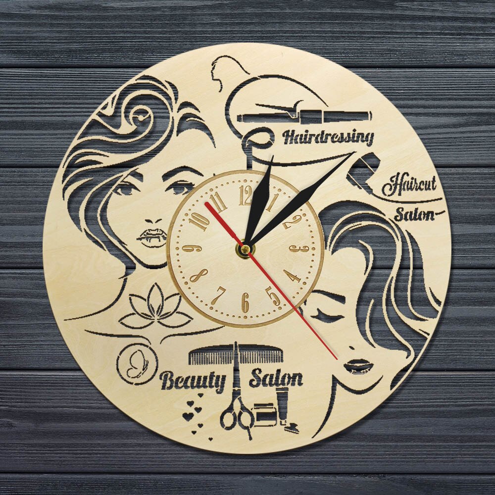 Ten unikalny zegar wykonany jest z naturalnego drewna, co gwarantuje trwałość i ekologiczny charakter. Jego okrągła tarcza zdobiona jest precyzyjnymi wycięciami, przedstawiającymi eleganckie profile kobiet, a także ikoniczne narzędzia fryzjerskie: nożyczki, grzebień, suszarkę i prostownicę. Delikatne inskrypcje, takie jak "Hairdressing", "Hairdresser Salon" i "Beauty Salon", subtelnie podkreślają jego przeznaczenie. W centrum zegara znajduje się czytelna tarcza z wyraźnymi cyframi, zapewniająca łatwe odczytywanie godziny. To idealne połączenie praktyczności z artystycznym akcentem, które doskonale wkomponuje się zarówno w nowoczesne, jak i bardziej klasyczne aranżacje wnętrz.