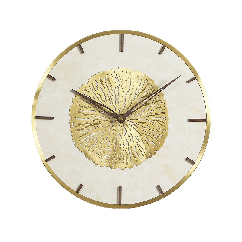 Centralnym punktem tego niezwykłego zegara jest jego misternie wykonane, złote zdobienie. Ta unikalna, reliefowa struktura w kształcie artystycznie pofalowanego liścia lub delikatnego koralowca nie tylko wspaniale odbija światło, tworząc dynamiczne refleksy, ale także dodaje głębi i trójwymiarowości. Każdy detal został dopracowany z precyzją, by podkreślić luksusowy charakter zegara. Połączenie błyszczącego złota z delikatnym, marmurowym tłem tarczy tworzy kontrast, który jest jednocześnie wyrazisty i subtelny, czyniąc ten Elegancki zegar ścienny ze złotym zdobieniem prawdziwą ozdobą każdej ściany. To nie tylko funkcjonalny zegar, ale przede wszystkim spektakularna dekoracja, która mówi wiele o Twoim wyczuciu stylu.