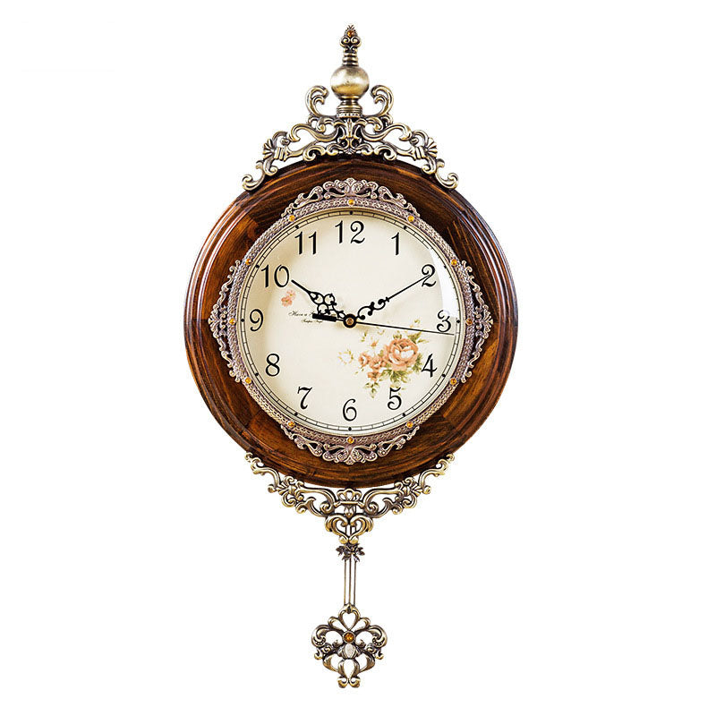 Każdy szczegół tego zegara został dopracowany z najwyższą starannością. Okrągła tarcza, osadzona w solidnej, rzeźbionej ramie z ciemnego drewna, otoczona jest delikatnym, metalowym ornamentem. Kwitnący wzór róż na cyferblacie dodaje mu romantycznego charakteru, a eleganckie, czarne cyfry i ozdobne wskazówki zapewniają doskonałą czytelność. Całość wieńczy misternie zdobiona korona u góry oraz, co najważniejsze, eleganckie wahadło. Jego rytmiczne, spokojne ruchy dodadzą Twojemu domowi poczucia spokoju i ponadczasowości, a bogate, metalowe zdobienia podkreślają luksusowy charakter całego projektu.