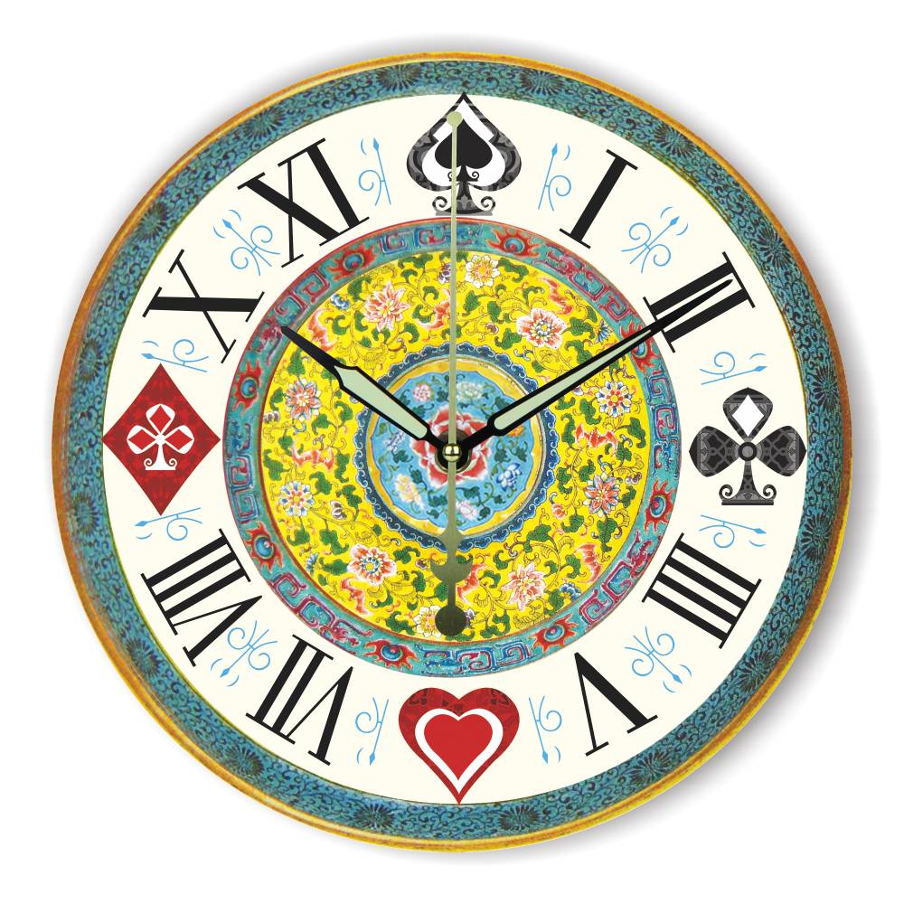 Każdy element tego zegara został zaprojektowany z myślą o stworzeniu niepowtarzalnego charakteru. Tarcza z eleganckimi cyframi rzymskimi w połączeniu z czterema symbolami kart do gry – pik, trefl, kier i karo – w miejscach tradycyjnych godzin 3, 6, 9 i 12, nadaje mu intrygujący i zabawny wygląd. Centralna część zegara zdobi bogaty, wielobarwny wzór florystyczny, inspirowany azjatycką sztuką, który wspaniale kontrastuje z postarzaną, złotą obwódką i turkusowym, misternym ornamentem. To połączenie tworzy głębię i autentyczność, sprawiając, że zegar wygląda, jakby został odnaleziony na egzotycznym strychu, pełnym dawnych skarbów. To nie tylko wskaźnik czasu, ale przede wszystkim wyrafinowana dekoracja, która wprowadzi do Twojego wnętrza nutę luksusu i oryginalności.