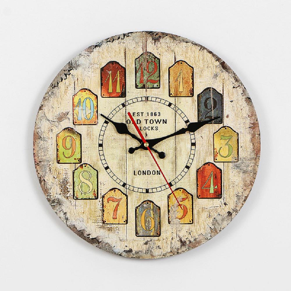Każdy element tego zegara został starannie zaprojektowany, aby oddać esencję prawdziwego stylu vintage. Duża, okrągła tarcza imitująca postarzone drewno, z celowymi przetarciami i nierównościami, przypomina autentyczną deskę wyciągniętą prosto z wiekowej chaty lub industrialnego warsztatu. Co wyróżnia nasz Zegar ścienny w amerykańskim stylu vintage, to unikalne cyfry umieszczone na kolorowych, prostokątnych tabliczkach. Te indywidualne ‘szyldy’ z postarzanymi numerami od 1 do 12, w odcieniach bladych czerwieni, zieleni, błękitów i żółci, dodają zegarowi niezwykłego uroku i artystycznego charakteru. Subtelne napisy "EST 1863 OLD TOWN LOCKS LONDON" na środku tarczy dodatkowo podkreślają jego historyczną proweniencję i nadają mu międzynarodowy, podróżniczy wymiar, doskonale wpasowując się w globalne inspiracje amerykańskiego vintage.